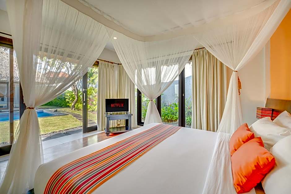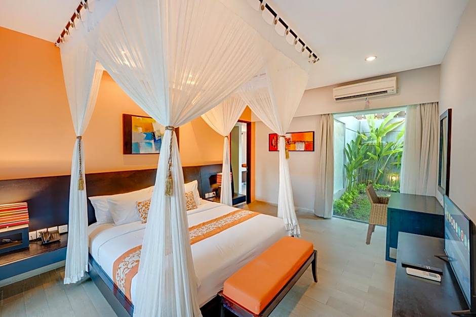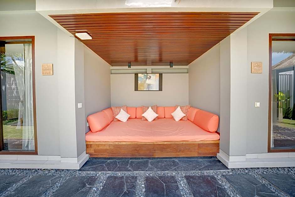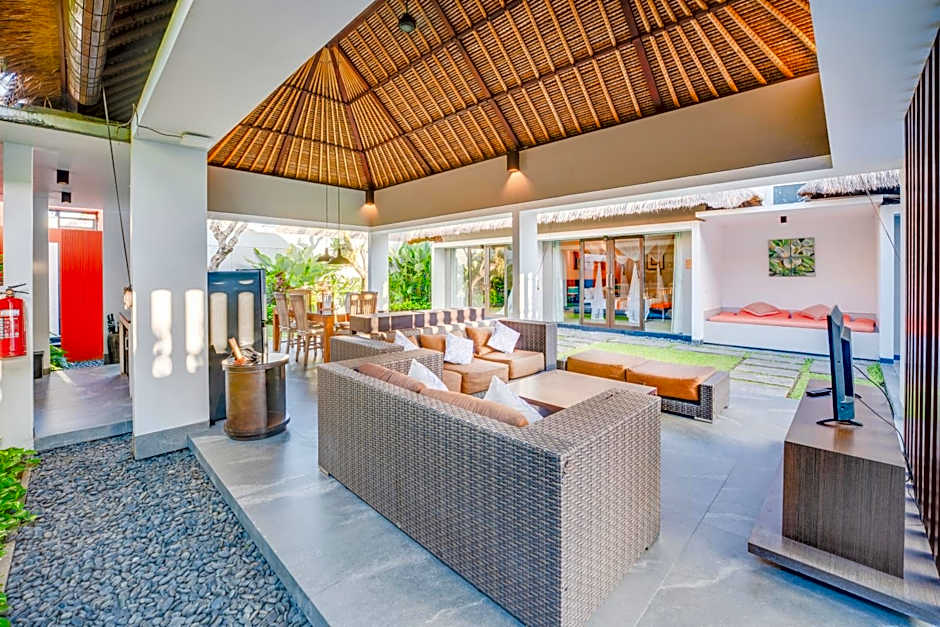 Villa with a private entrance features a private pool with lounge chairs, private kitchenette, living room and butler service.